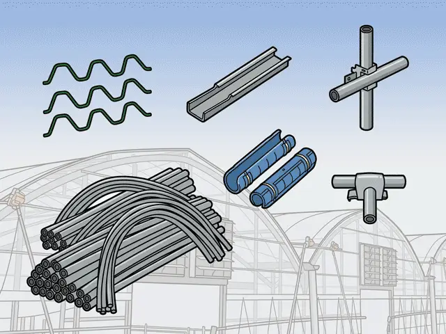 ビニールハウスの基礎資材や部品で、ビニールハウスの構成とメンテナンスに必要な部品や資材。 農業用鋼管、パッカー、ハウスバンドなど、ハウスの骨組みや被覆材の固定に使用される部品が含まれます。