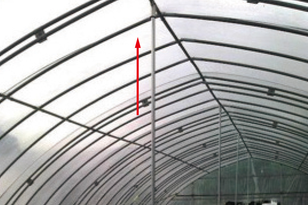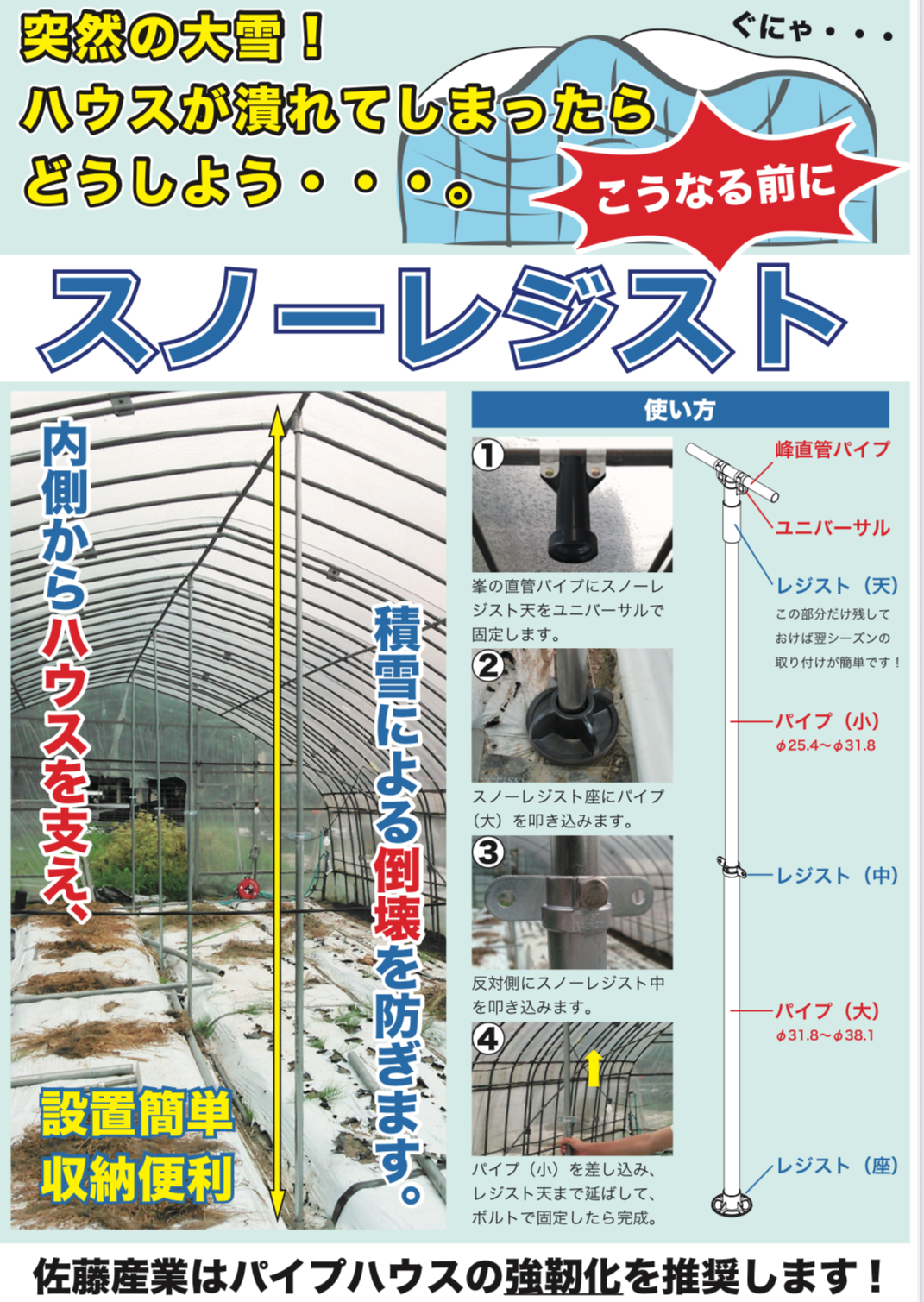 設置しやすく、収納に便利な一体式ユニットです。内側からハウスを支え、積雪による倒壊を防ぎます。